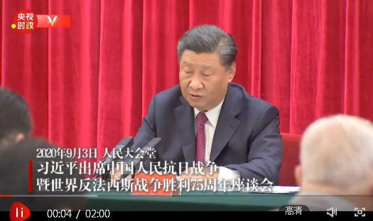 中共中央、国务院、中央军委3日下午在人民大会堂举行座谈会,纪念中国人民抗日战争暨世界反法西斯战争胜利75周年。中共中央总书记、国家主席、中央军委主席席大大发表重要讲话。
