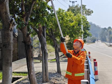 郑文在G228线修剪路树(连江公路中心供图) 在巡查过程中,郑文发现部分行道树因近期雨水充沛而枝繁叶茂,已有枝条遮挡了交通标志牌,甚至探入车道,影响通行安全。遇此情况,他没有片刻犹豫,立即拿起修剪工具,戴好手套、系紧安全带,麻利地开始作业。“郑文叔,我来吧,您歇会儿。”身边的年轻同事林晟见状连忙上前劝他歇一歇。他却只是笑着摆摆手:“我干习惯了,放心。”阳光透过树叶洒在他的身上,那双经历了岁月打磨的手,依旧稳健有力,修剪动作干净利落、不留死角。排除完安全隐患后,他又背起工具,踏上下一段巡查路程,一如往昔。