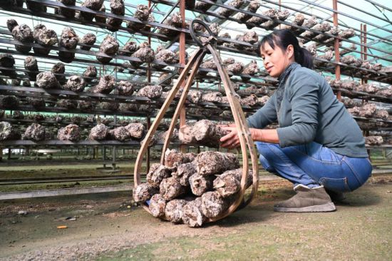 屏南县路下乡富塘造福新村脱贫户吴玉秀在当地食用菌基地劳作。新华社记者 林善传 摄