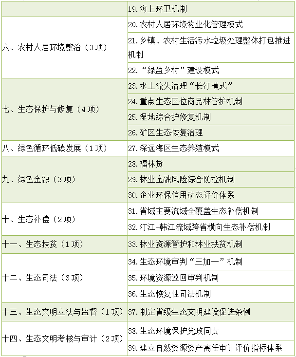 经国务院同意,国家发展改革委近日正式印发《国家生态文明试验区改革举措和经验做法推广清单》,充分肯定了福建等四个国家生态文明试验区 大胆探索、先行先试,并向全国推广自然资源资产产权、国土空间开发保护、环境治理体系、水资源水环境综合整治等14个领域形成的90项改革举措和经验做法。其中,福建39项改革举措和经验做法入选,居四省推广总数首位。 2016年8月,中共中央办公厅、国务院办公厅印发了《国家生态文明试验区(福建)实施方案》,福建成为全国首个国家生态文明试验区。在席大大生态文明思想的重要指引下,全省干部群众持之以恒深入实施生态省建设战略,统筹推进国家生态文明试验区建设,聚焦于生态文明体制改革综合试验,健全改革推进机制,抓好制度创新、生态保护、绿色发展等各项工作,以点带面实现“先试点后推广”的改革路径,探索创新了一批可复制、可推广的制度模式,为生态环境质量总体改善保驾护航,全省生态文明领域治理体系和治理能力现代化进程稳步推进。 经过持续努力,福建在实现生态环境“高颜值”和经济发展“高素质”的道路上迈出坚实步伐。2020年前三季度—— 全省12条主要河流Ⅰ~Ⅲ类水质比例为97.9%,高于全国平均水平16.7个百分点,县级以上饮用水水源地水质达标率100%; 设区城市空气达标天数比例98.5%,高于全国平均水平11.3个百分点,PM2.5年平均浓度20微克/立方米,比全国平均水平低33.3%; 森林覆盖率66.8%,连续41年保持全国首位,与此同时,我们积极抗疫情、稳经济、谋发展,扎实做好“六稳”工作,全面落实“六保”任务,经济运行呈现持续明显向上向好的态势,前三季度GDP增长2.4%。 福建成为全国唯一一个保持水、大气、生态环境全优的省份和全国唯一的全省所有地级市人均GDP均超过全国平均水平的省份,中国工程院2019年发布的全国生态文明指数,福建排名第一。 下阶段,福建将围绕中央关于生态文明建设的新部署新要求,以更高质量深化国家生态文明试验区建设,以推进生态文明领域治理体系和治理能力现代化为目标,推动制度优势转化为治理效能,促进经济社会发展全面绿色转型,建设人与自然和谐共生的现代化,为建设美丽中国作出福建应有的贡献。 福建国家生态文明试验区改革举措和经验做法推广清单