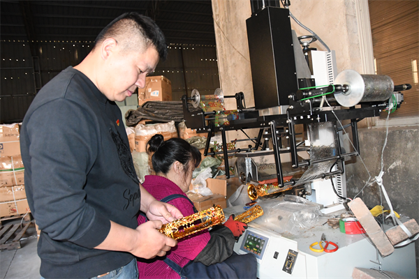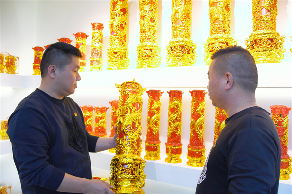王志鹏(左)兄弟正在查看研发的新产品 “今年是龙年,我特意开发了新产品,现在十分畅销。”看着自己的研究成果,王志鹏显得十分高兴。他说,环境一直在变,我必须要有创新思维,否则难以在市场上立足。为了研制新产品,他自学工板、自己创作、亲自试验。王志鹏回忆起来,仍然记得在部队当班长时说过的话,做什么事都要以身作则,只有自己冲在最前面才能带领更多的人冲锋。 谈及企业发展面临的压力,王志鹏直言,压力常伴企业左右。“人无远虑,必有近忧”,并认为“化解压力一定要打好‘提前量’,就不会有措手不及的事情,就能度过各种危机。” 疫情期间,是企业经营最困难的时候。最少时公司只有1-2名工人,但兄弟俩仍坚持诚信经营的标准,答应的货总是想方设法、加班加点送到。如今,王志鹏兄弟创办的常光鸿运工贸有限公司高峰时期员工有近百人,全部是附近村庄留守中老年人。