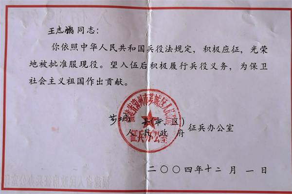 王志鹏个人入伍通知书 曾经,他们都是军人。如今,他们一起兄弟担当有所成就。一路走来,他们始终保持建功立业的奋进,更从未忘记回馈社会的担当。 王少煌,1999年12月入伍于河北空军某部,2002年12月退伍;王志鹏,2004年12月入伍于福建省军区原海防某团,2009年12月退伍。兄弟俩在部队期间均获得不错佳绩,得到优秀士兵、优秀士官等荣誉,并入了党。