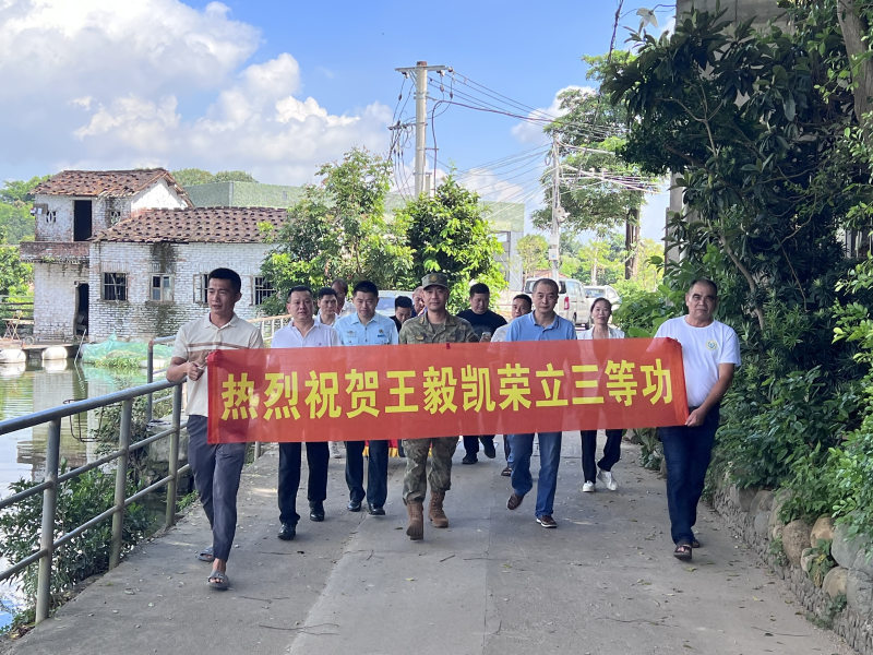军营建功勋,家乡传美名。7月3日上午,伴随着阵阵锣鼓声,龙文区人武部和区退役军人事务局组成报喜慰问组,来到朝阳街道恒坑村荣立三等功的现役军人王毅凯家中。在喜庆又热烈的氛围中,将“三等功”喜报和慰问金送到军属手中,并为他们佩戴了荣誉绶带,向立功受奖家庭表示衷心的感谢,对军属的辛勤付出表示由衷的敬意。